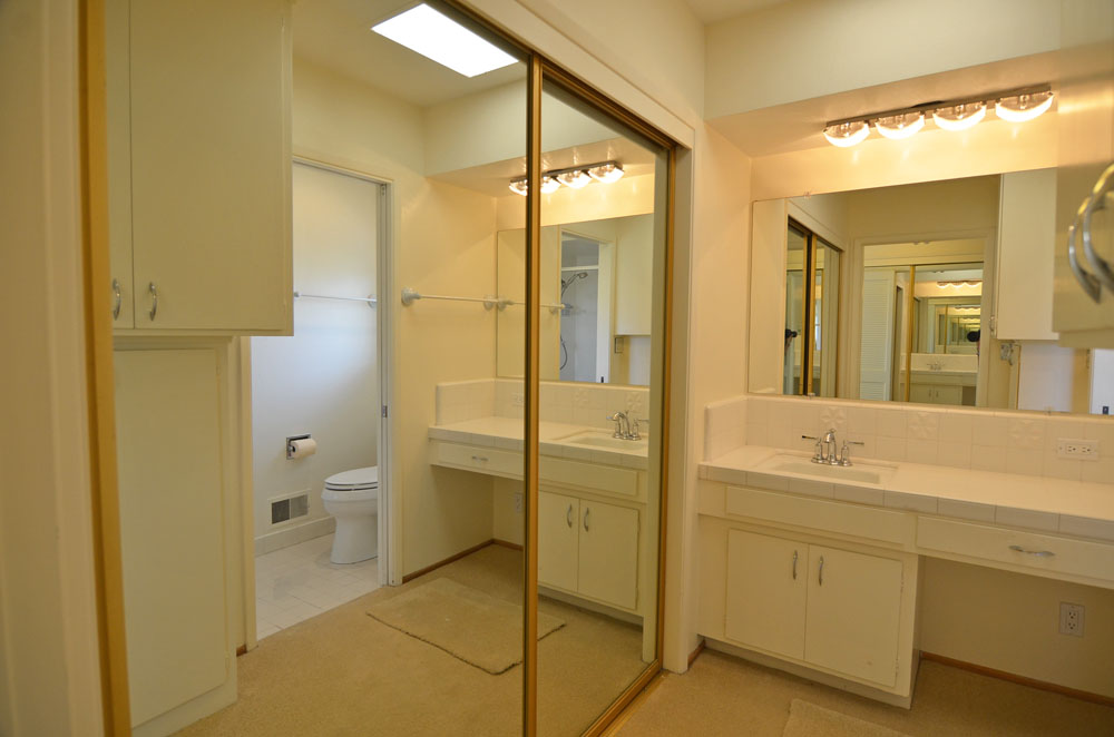 Hall Bathroom has Shower Over Tub and Double Sinks